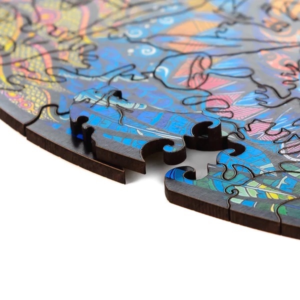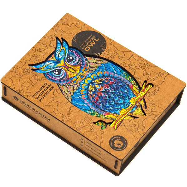 Die schönen Unidragon Puzzle - hier das Motiv Charming Owl in Größe M - sind farbenfrohe Puzzle-Kunstwerke aus Holz.