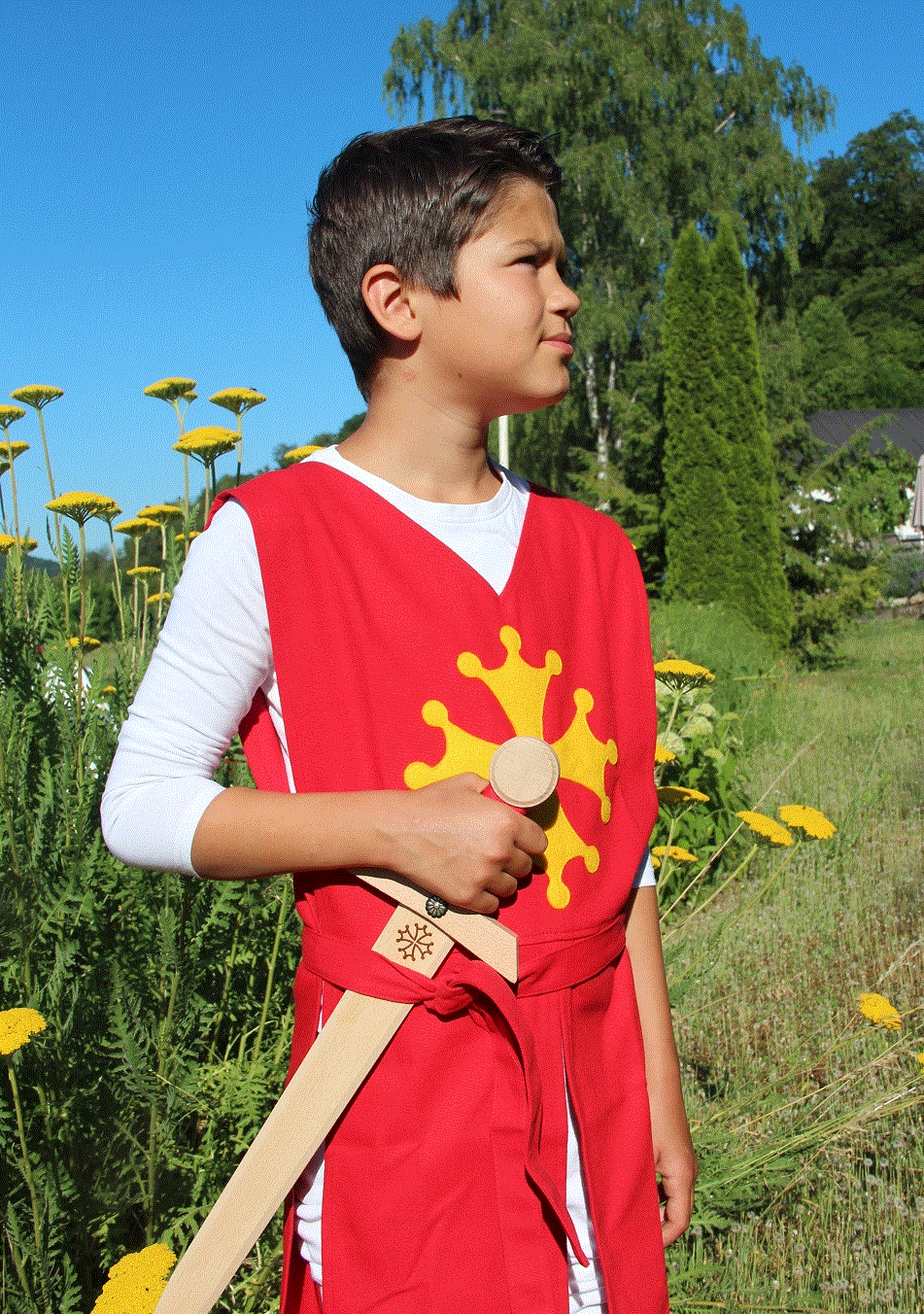 Der Wappenrock mit Bindegürtel passt jungen Rittern von ca. 5-12 Jahren. Er ist handgearbeitet aus strapazierfähiger Baumwolle.