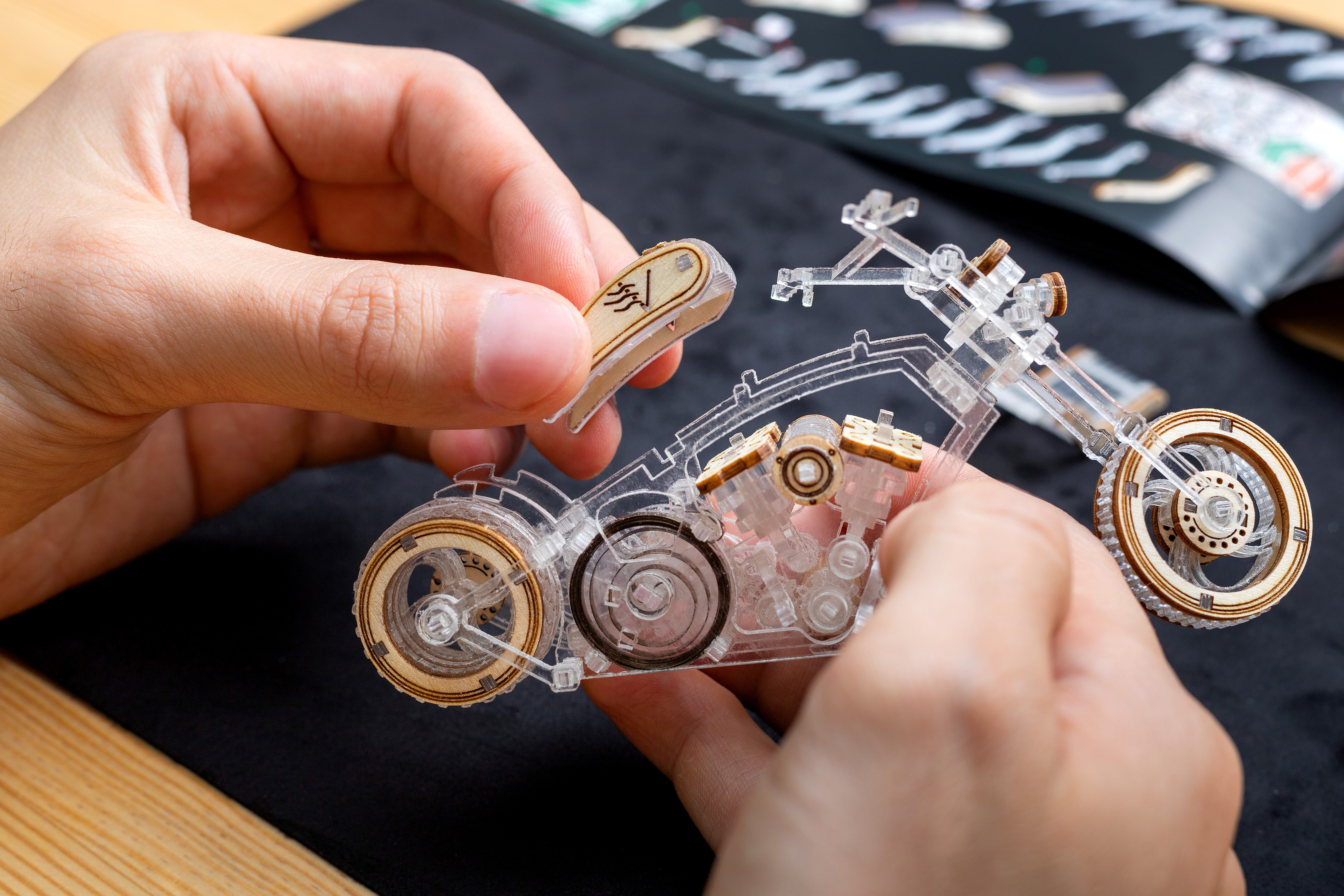 Die 3D-Bausätze werden aus lasergeschnittenen Bauteilen zusammengesetzt - alles ist montagefertig dabei. Die fertig gebauten Holzmodelle haben mechanische Funktionen oder Selbstantrieb. Die Ugears bleiben von Bauphase bis Ergebnis ein spannendes Projekt.