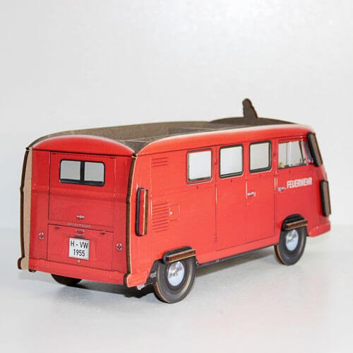 Dieser zusammensteckbare Feuerwehrwagen aus Pressholz macht sich gut auf dem Schreibtisch!