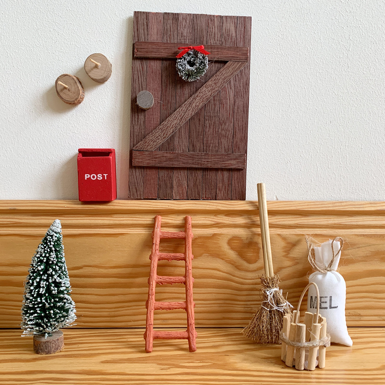 • Das Bastelset besteht aus 9 Teilen: 1 Wichteltür, 1 Leiter, 1 Tannenbaum 1 Besen, 1 Mehlsack, 1 Korb, 1 Briefkasten und 2 Haken