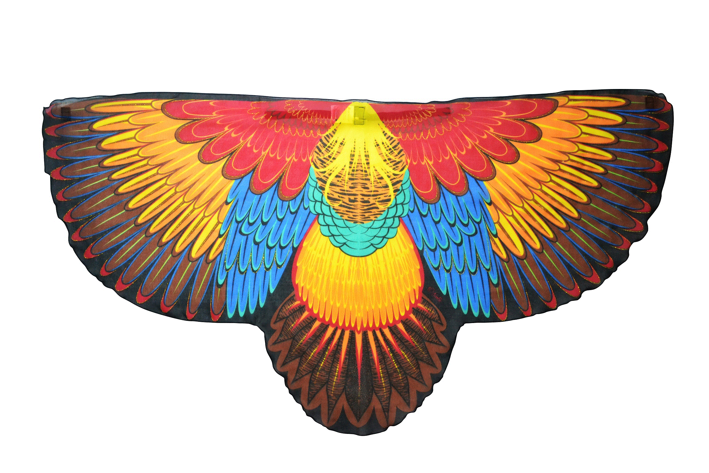 Farbenfroh bedruckte Stoffflügel. Die Spannweite beträgt ca. 110cm, mit elastischen Schulter- und Fingerschlaufen, bereit zum Tanzen, Springen und Flügelspreizen. Passt für mehrere Körpergrößen, die Flügel hängen bei kürzeren Armen dann ein bißchen mehr durch, sehen aber immer noch super aus.