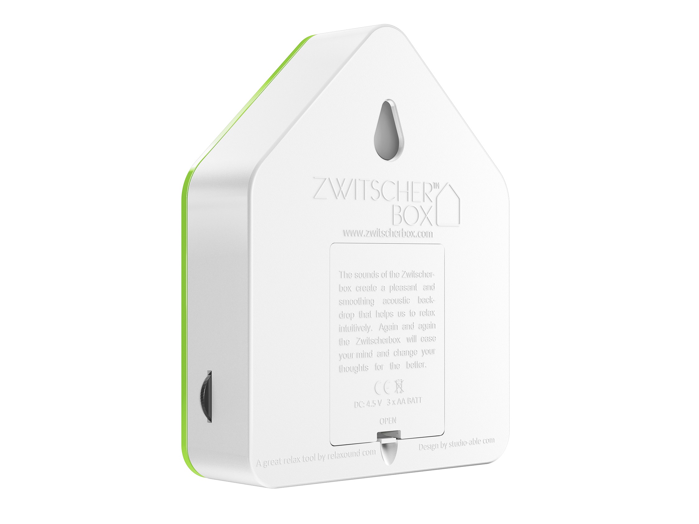 Ausgelöst durch einen Bewegungssensor tönt aus der Box liebliches Vogelgezwitscher (Amsel) in sehr guter Tonqualität. Die Lautstärke ist natürlich regelbar. Nach ca. 2 Minuten verstummt der Vogelwald wieder. Der schöne Klangteppich aus der Natur soll daran erinnern, sich Pausen zu nehmen, durchzuatmen und zu entspannen.