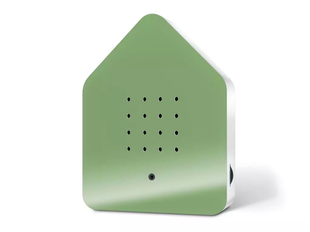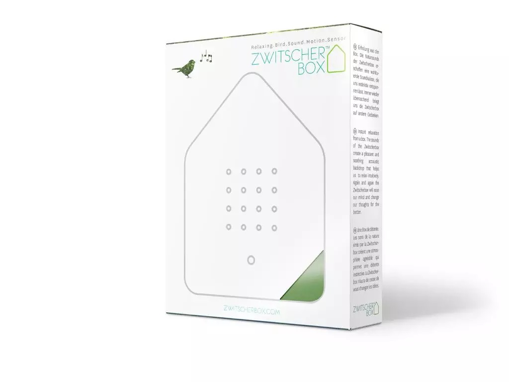 Wunderbar entspannend! Die Zwitscherbox hat die Form eines Häuschens mit schlicht elegantem Design - hier ein weißer Kunststoffkorpus mit grüner Front. Sie kann aufgehängt oder gestellt werden und verbreitet nun Waldatmosphäre. Ausgelöst durch einen Bewegungssensor tönt aus der Box liebliches Vogelgezwitscher in sehr guter Tonqualität. Die Lautstärke ist natürlich regelbar. Nach ca. 2 Minuten verstummt der Vogelwald wieder. Der schöne Klangteppich aus der Natur soll daran erinnern, sich Pausen zu nehmen, durchzuatmen und zu entspannen.
