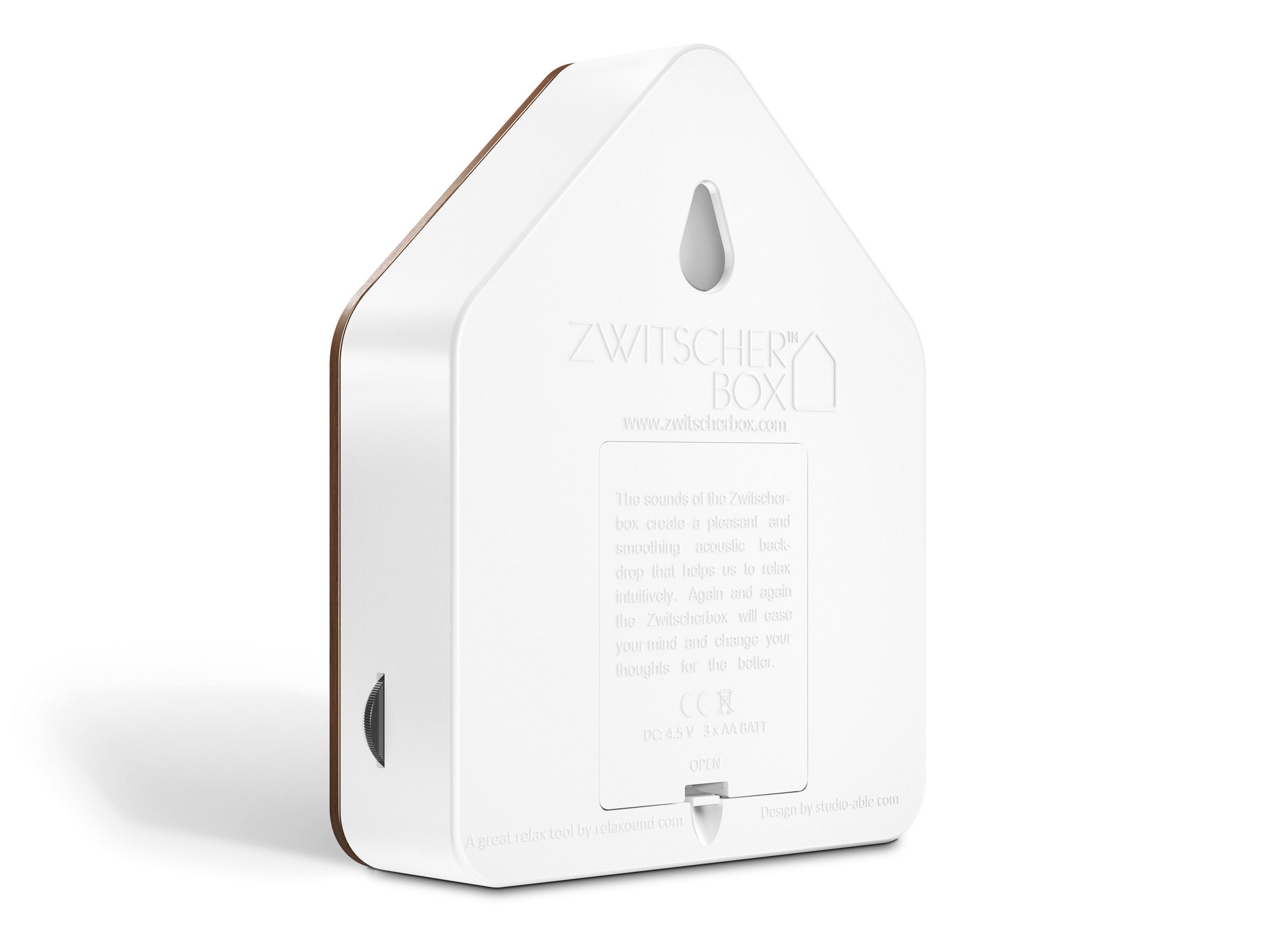 Wunderbar entspannend! Die Zwitscherbox hat die Form eines Häuschens mit schlicht elegantem Design - hier ein weißer Kunststoffkorpus mit edler Eichenholzfront. Sie kann aufgehängt oder gestellt werden und verbreitet nun Waldatmosphäre.
