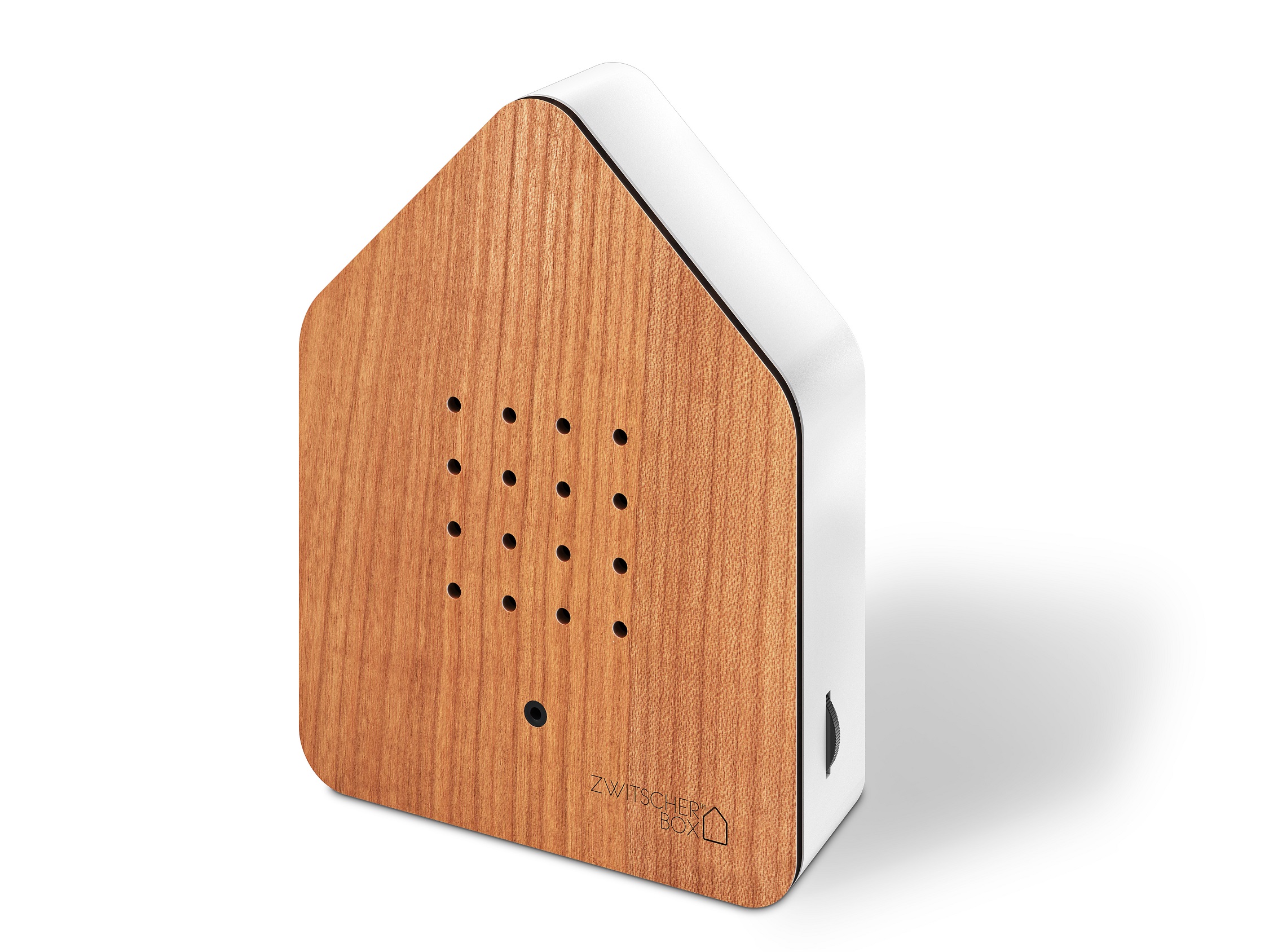 Wunderbar entspannend! Die Zwitscherbox hat die Form eines Häuschens mit schlicht elegantem Design - hier ein weißer Kunststoffkorpus mit Kirschholzfront. Sie kann aufgehängt oder gestellt werden und verbreitet nun Waldatmosphäre.