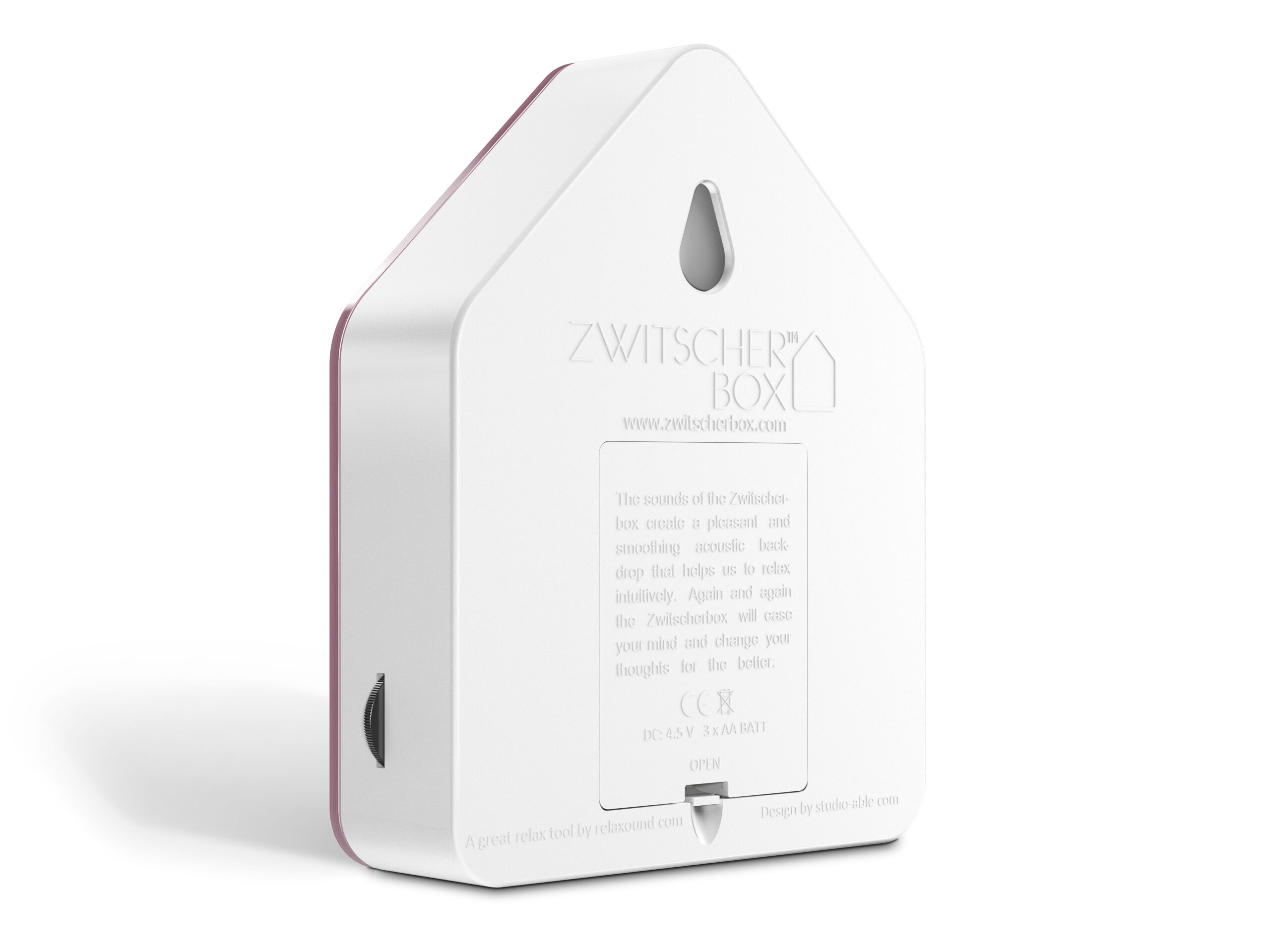 Die Zwitscherbox hat die Form eines Häuschens mit schlicht elegantem Design - der Kunststoffkorpus ist weiß mit farbiger Front. Sie kann aufgehängt oder gestellt werden und verbreitet nun Waldatmosphäre.