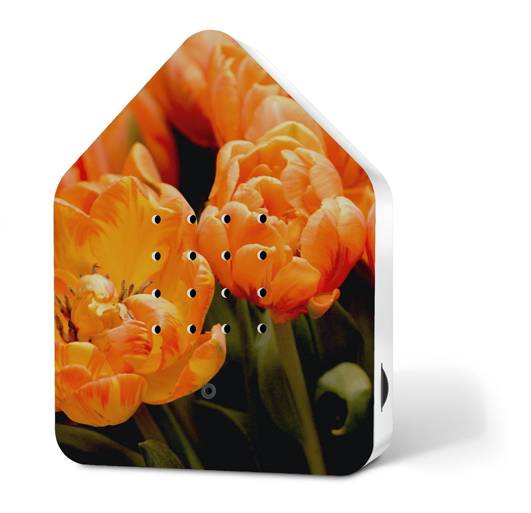 Dieses limtierte Design der Zwitscherbox Blossom Edition zeigt auf der Vorderseite prächtige Tulpen in orange/apricot Tönen. Frühlingshaft!