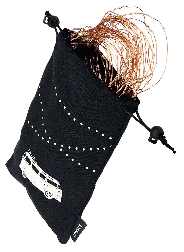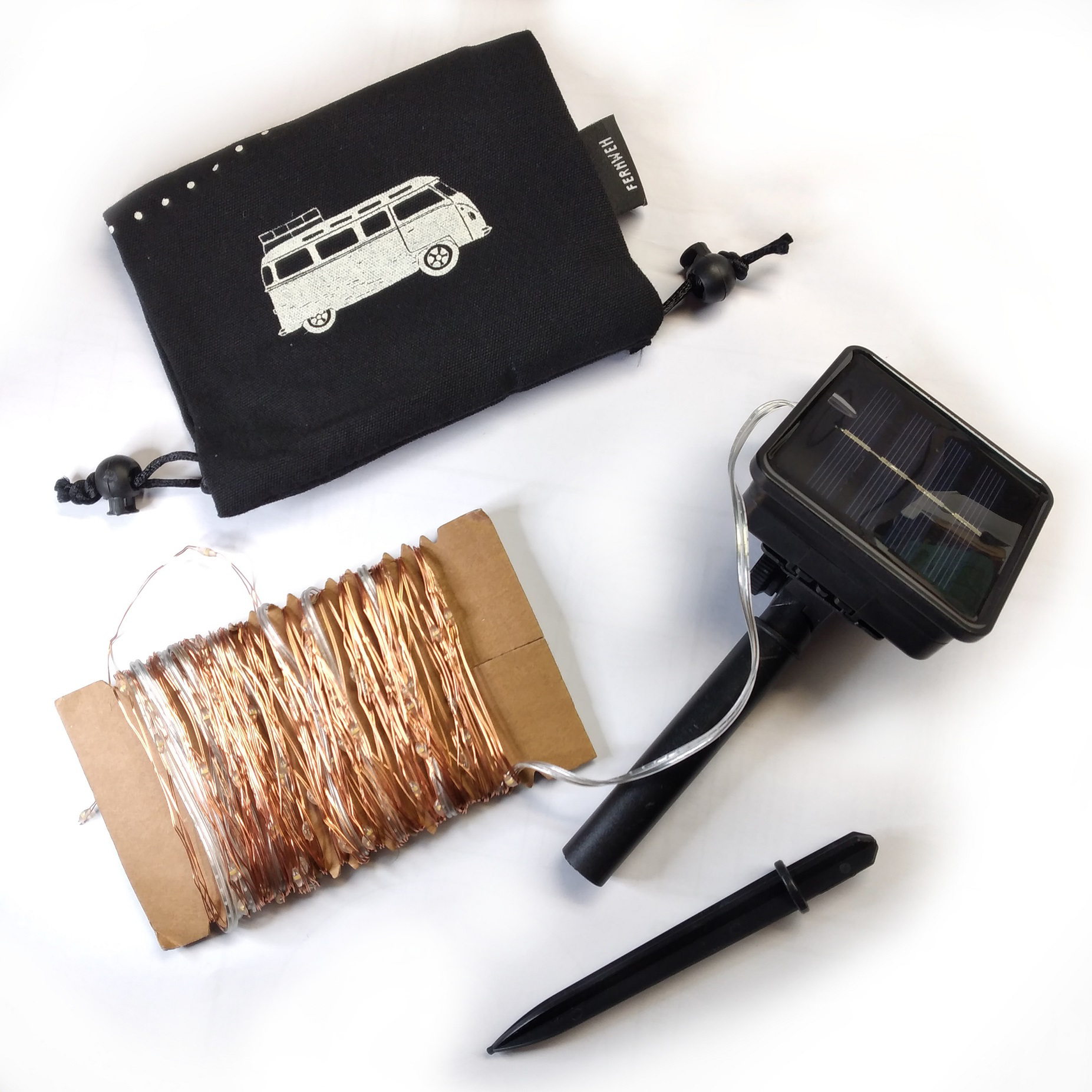 Da die Lichterkette mit einem Solarpanel und integriertem Akku ausgestattet ist, kann sie einfach in der Sonne aufgeladen werden und ist so besonders energiesparend und umweltschonend. Das Solarpanel hat einen Erdspieß und kann so perfekt an einem sonnigen Ort platziert werden und sobald die Dämmerung einsetzt, beginnt die Lichterkette zu leuchten. Dank insgesamt etwa 15 Meter Kabellänge lässt sich die Lichterkette individuell am Wohnmobil, rund um den Balkon oder an dem Baum befestigen. Ein toller Baumwollbeutel zum verstauen ist auch dabei.